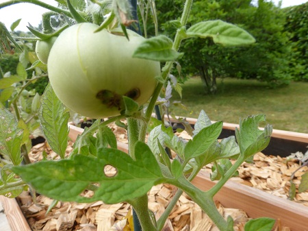 bonjour, j'ai planté des tomates dans un jardin potager surélevé avec un paillage - elles poussent normalement sauf une qui commence à être abimée, je ne sais pas pourquoi ? j'envoie une photo - merci