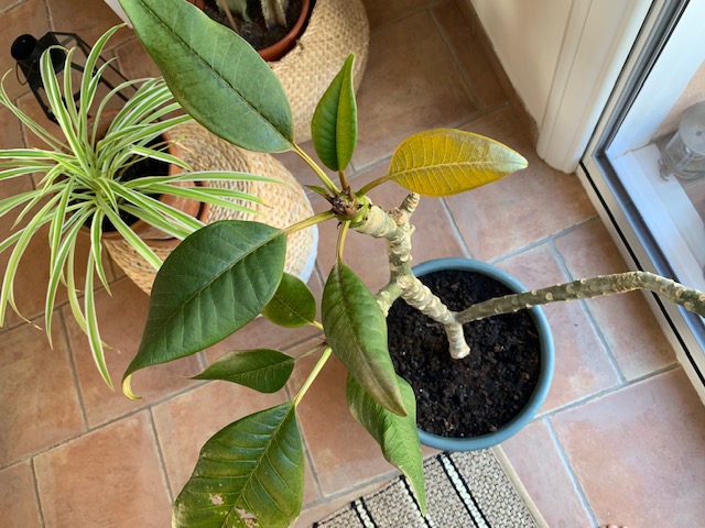 Mon frangipanier a sagement passé l’hiver à l'intérieuravec peu voire pas d’arrosage.