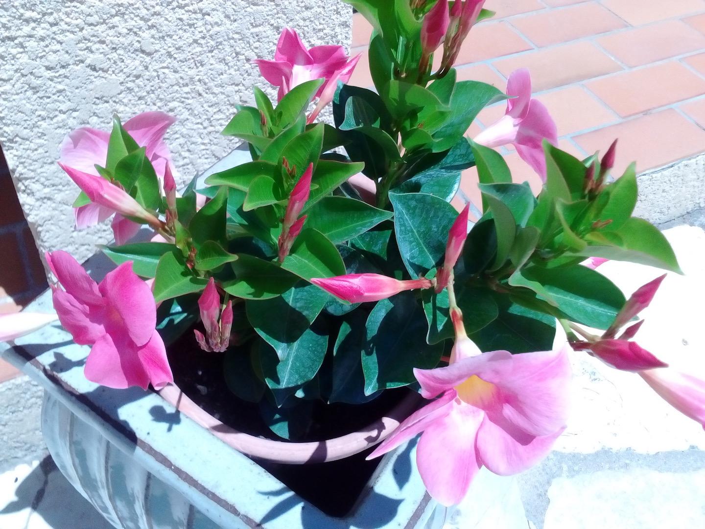 Peut être des dipladénias, les roses ou rouges qui tranchent avec le blanc du jasmin.....et qui repoussent d'une année sur l'autre si il ne gèle pas trop...