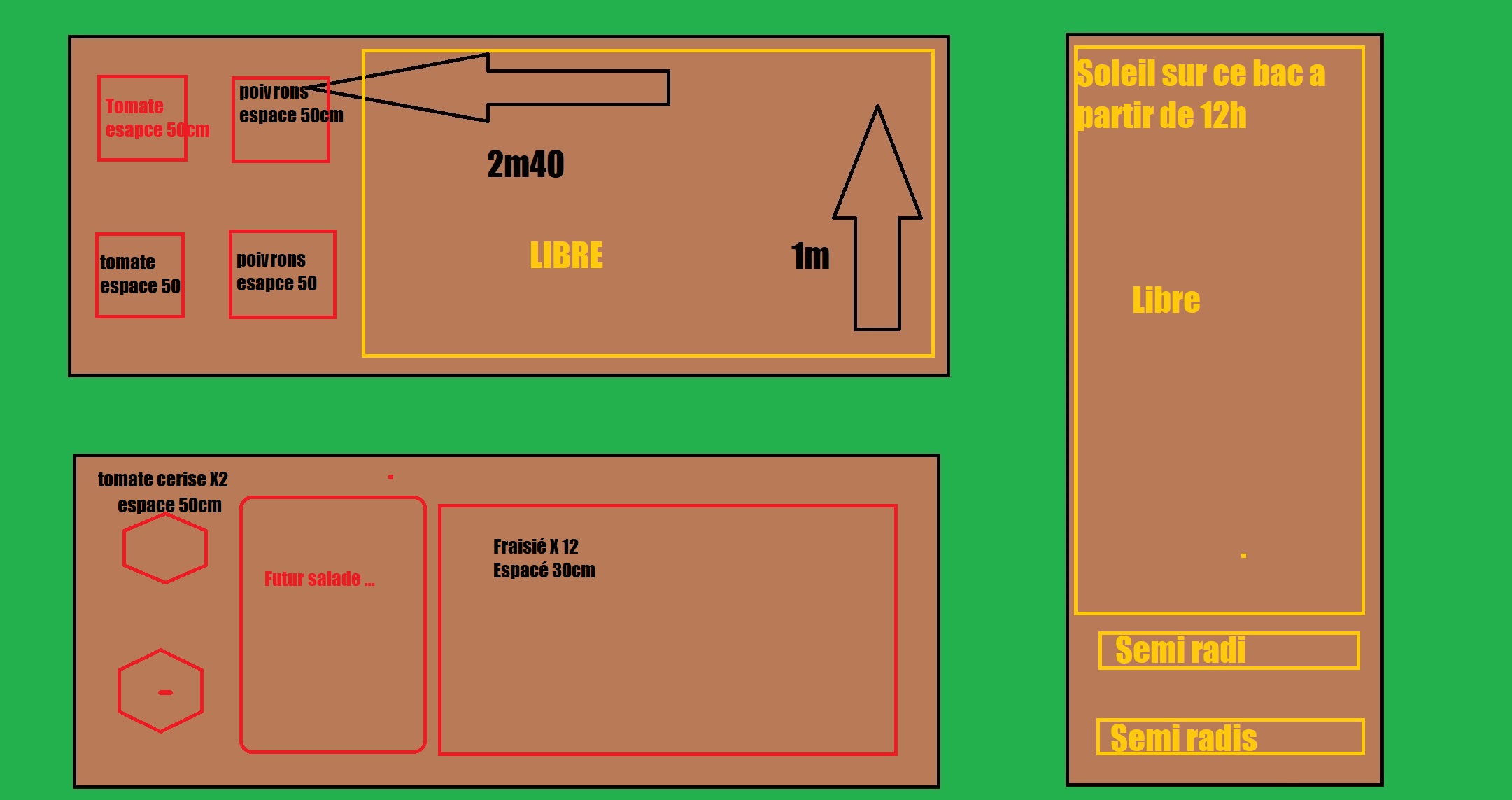 Je compte mettre semaine prochaine des semi de petit poid on ma dit que c'etais bon sa je vais en mettre sur 2 ranger en largeur d'un bac on vera ce que sa donne avec du grillage tenu par du bambou