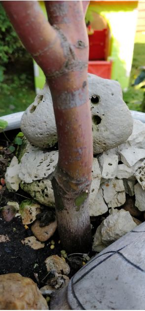Mon Sangoku kaku à bien commencer à pousser puis il s'est soudainement arrêter, depuis des branches aux extrémités deviennent noirs et j'ai remarqués des taches noirs sur un des deux tronc principale.