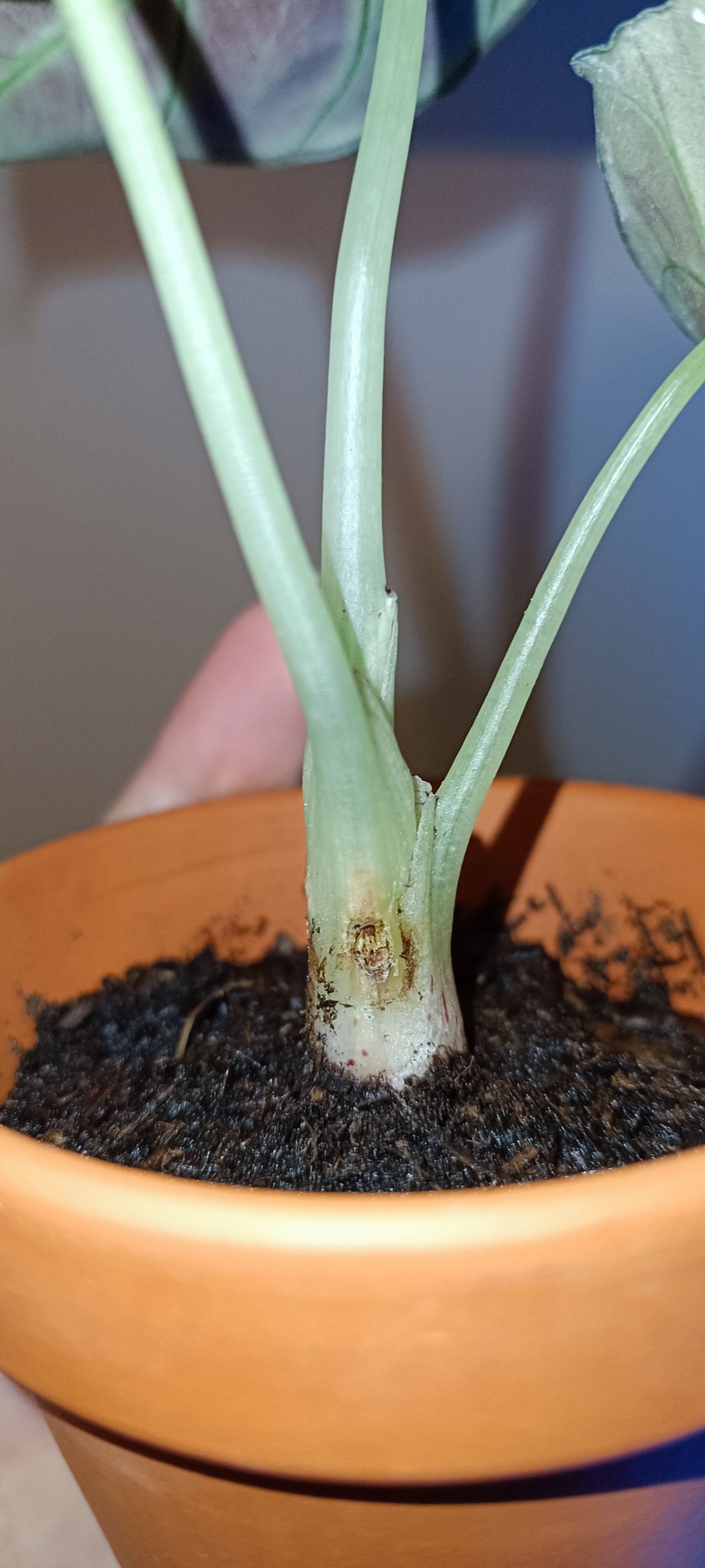 Bonjour tout le monde, j'ai un gros problème avec un alocasia. Je me suis rendue compte qu'il y avait un gros trou a la base des tiges, est ce que quelqu'un peut me dire de quoi ça vient et si je peut y faire quelque chose svp ?