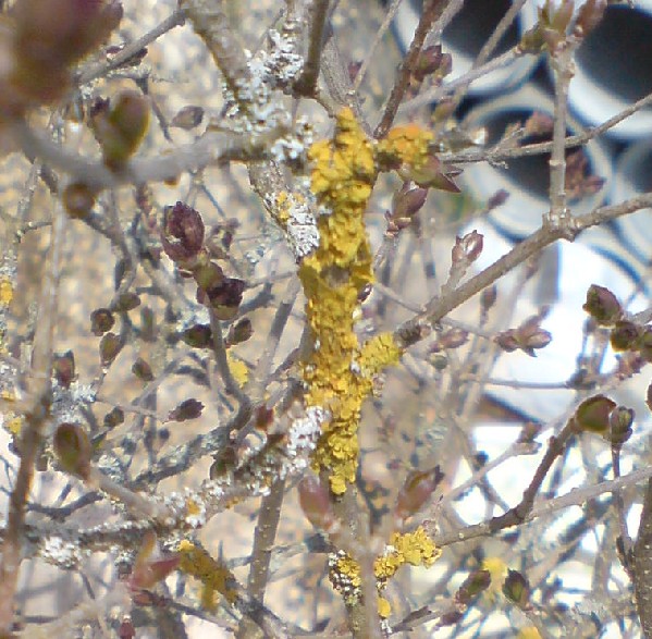 Mais aussi sur les groseillers, avant que ça ne contamine les autres. Celui qui a beaucoup de lichens donne moins de fruits (mais j'avoue qu'il est aussi plus âgé...)