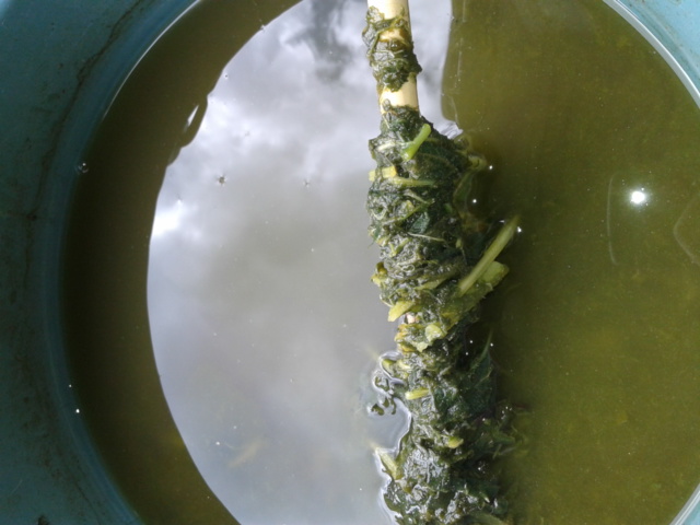 lundi dernier j'ai préparé mon premier purin de consoude 1kg pour 10 litres d'eau de puit dans un seau en plastique juste recouvert d'une moustiquaire dans un garage et brassé chaque jour. J'ai coupé la consoude en morceaux.
