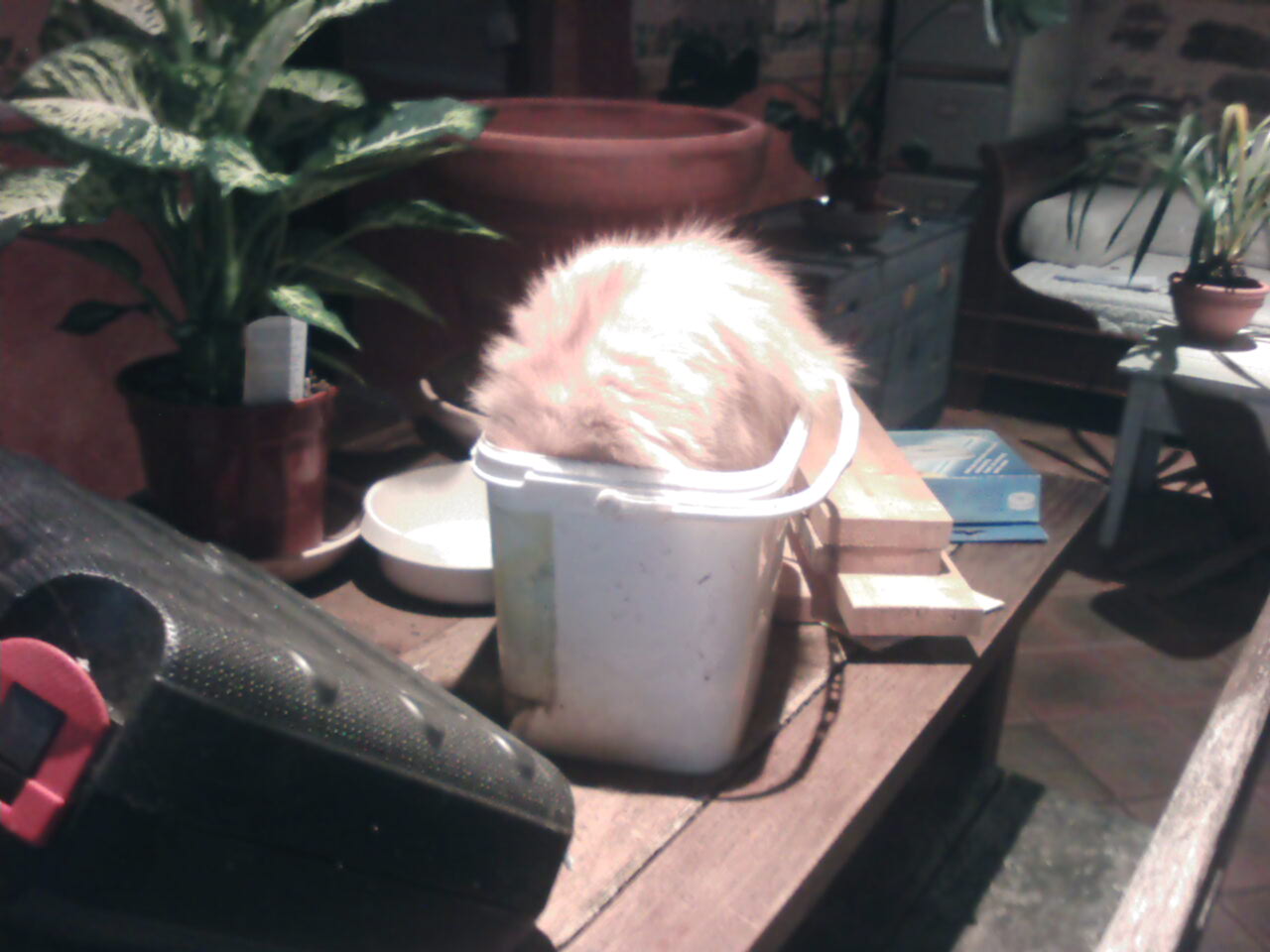 Ca y est ! il dort..... La tête enfouie dans le seau, la lumière le gène....