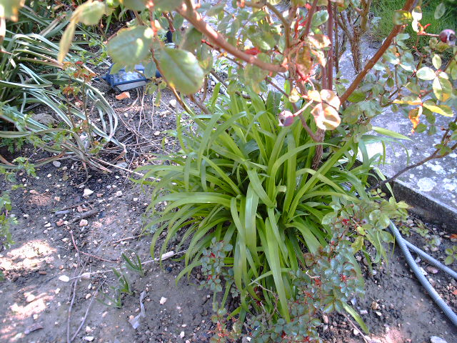 il y a des fleurs fanées dessus car le propriétaire précédent ne les avait pas retirées. Il nous a parlé d'un arbuste d'origine chinoise ou japonnaise et dans le jardin il s'entrecroise avec un rosier buisson de la même hauteur