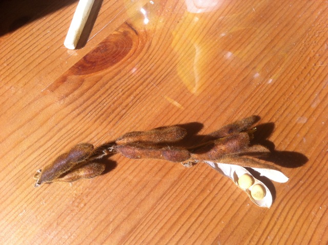 Des cosses poilues marrons avec des petites boules jaunes ressemblants à de petits pois chiches...