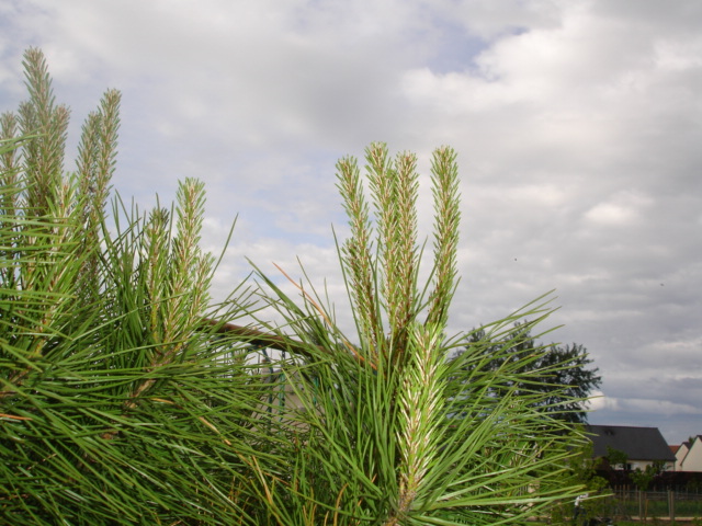 Oui bien sur il fait des pousses(voir photo jointes). Elles sont belles et bien verte. Sinon dans le coin oui il y a des pins parasol qui poussent et ils n'ont pas l'air d'avoir de problème. L'alternance glaise humide et béton l'été n'est pas encore effective puisque les chaleurs ne sont pas encore ...