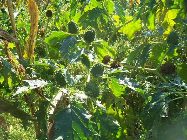 dans l'entrée du champs de maïs de mon voisin, il y a cette plante de 1 m de haut environ, avec des boules piquantes contenant des dizaines (ou centaines) de graines. Dois-je en avoir peur ???