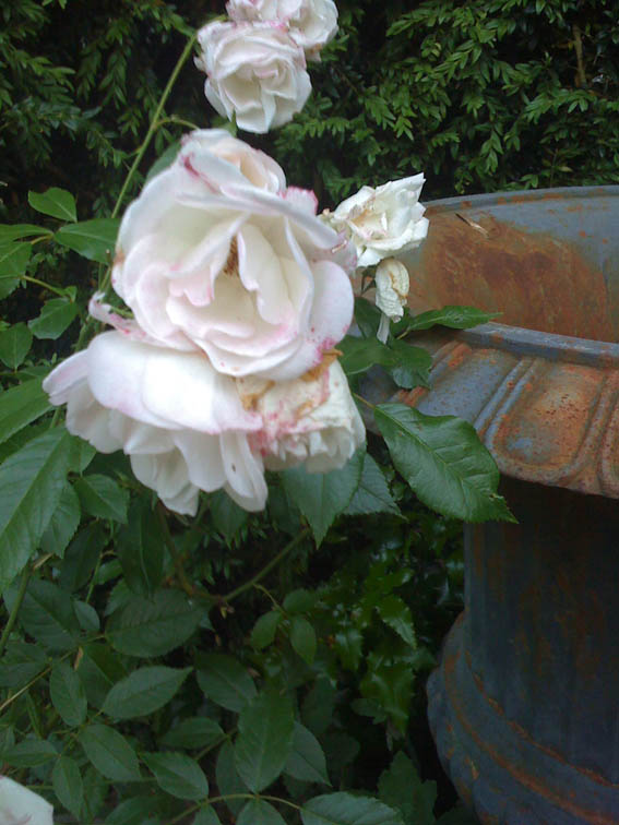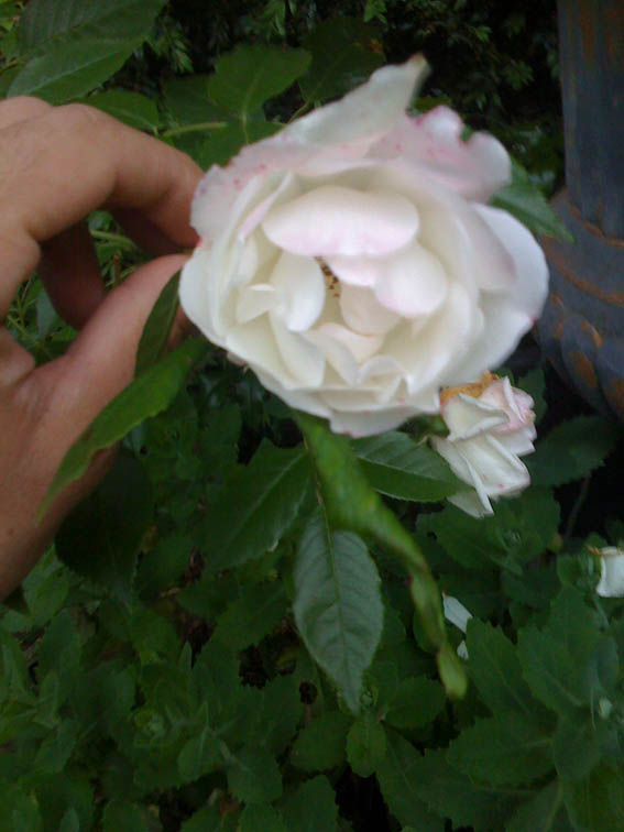 j'ai trouvé ces 2 rosiers dans mon jardin quand j'ai acheté la maison voici 3 ans, je ne sais pas s'ils sont de la même variété, ils sont blanc pur avec quelques tâches roses, le bouton est rose pâle. Ils font à peu près 1m de haut mais cela ne veut rien dire car ils étaient dans de telles ...