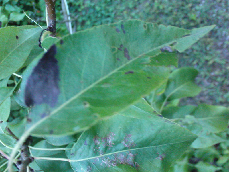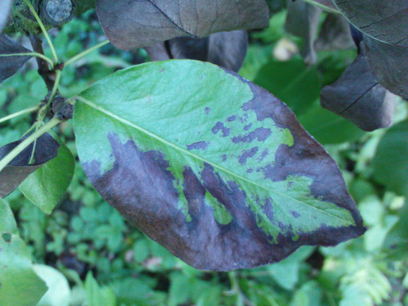 Une semaine plus tard, je reviens ici. La situation a peu évolué : certaines feuilles noircissent, alors que d'autres sont parfaitement saines. Sur les feuilles noircies, le pétiole reste bien vert. Aucun excudat visible nulle part : je ne crois donc pas au feu bactérien.