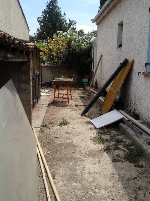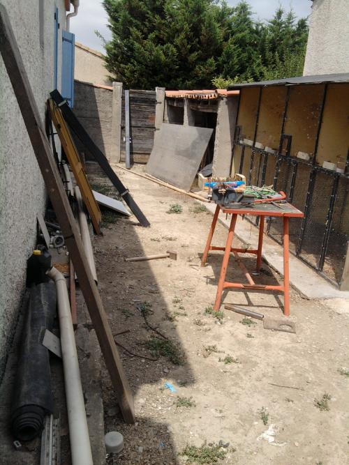 le batiment du fond qui est un abris bois va etre réduit de moitié en vue d'installer un grand portail. La cage a oiseaux elle aussi restera en attendant de se remplir :) . C'est un endroit trés chaud l'été.