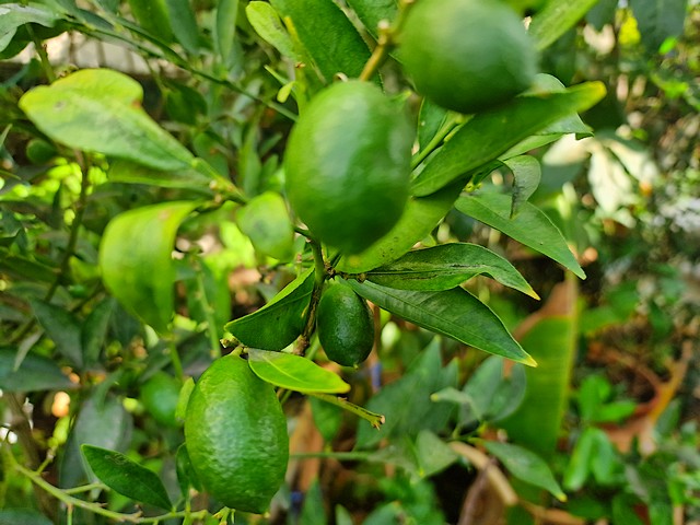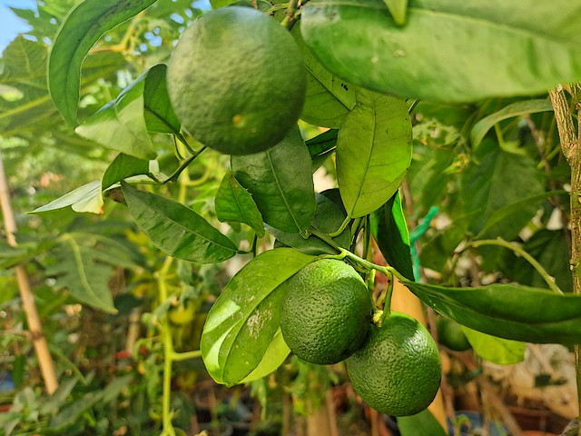 Le pomelo à chair rose écrase le citronnier 4 saisons qui lui sert de porte-greffe. Bientôt, le sécateur se chargera de l équilibre entre greffon et porte-greffe.