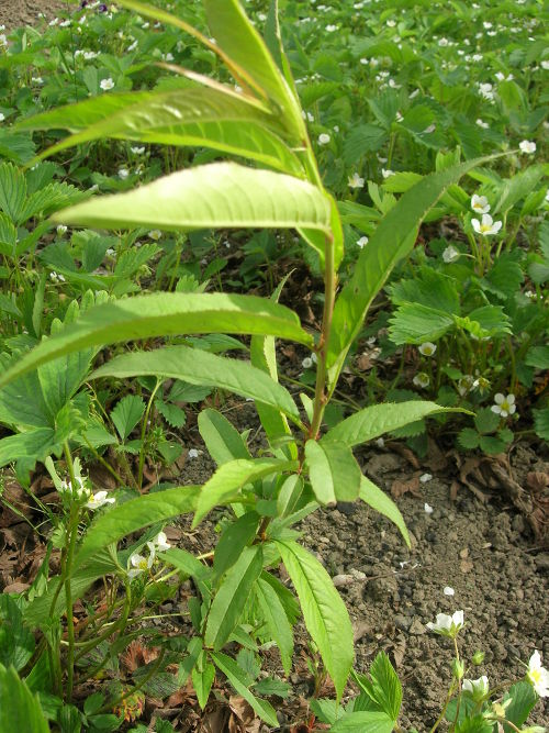 Quelqu'un pourrait il reconnaitre l'intrus aux longues feuilles qui pousse au milieu des fraisiers?