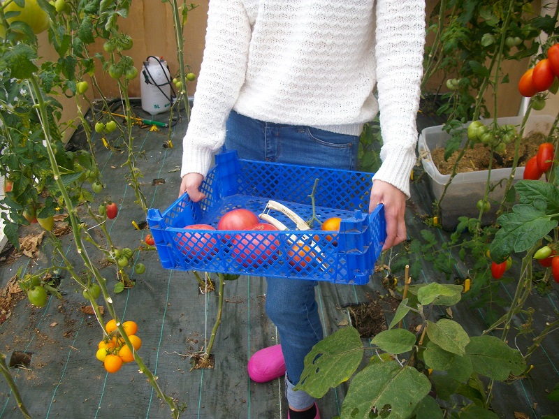 ce matin je ramasse avec ma sœur ! toujours en suivant les indications de papou, les fruits mûrissent ensemble sur les grappes !