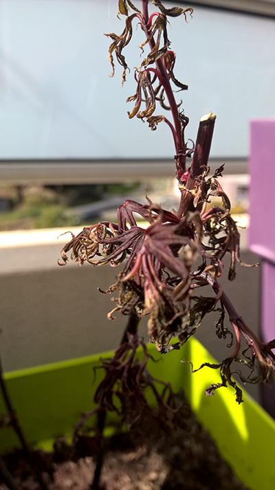 j'ai acheté un petit ERABLE JAPONAIS 'SHAINA' je l'ai planté dans un pot plus grand ou j'ai mis un melange de terre de bruyere et du terreau apres quelque jours les feuilles sont devenues toutes seches et la plante a l'air mal en point.