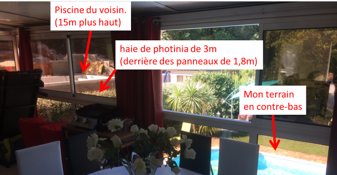 La maison voisine, du côté sud de ma maison, se trouve en bien hauteur : leur terrasse est à 15m au-dessus de mon terrain. Le voisin peut donc voir directement tout ce qui se passe sur mon jardin et ma piscine malgré une haie déjà en place, haut de 3m, qui nous sépare (du photinia je crois).