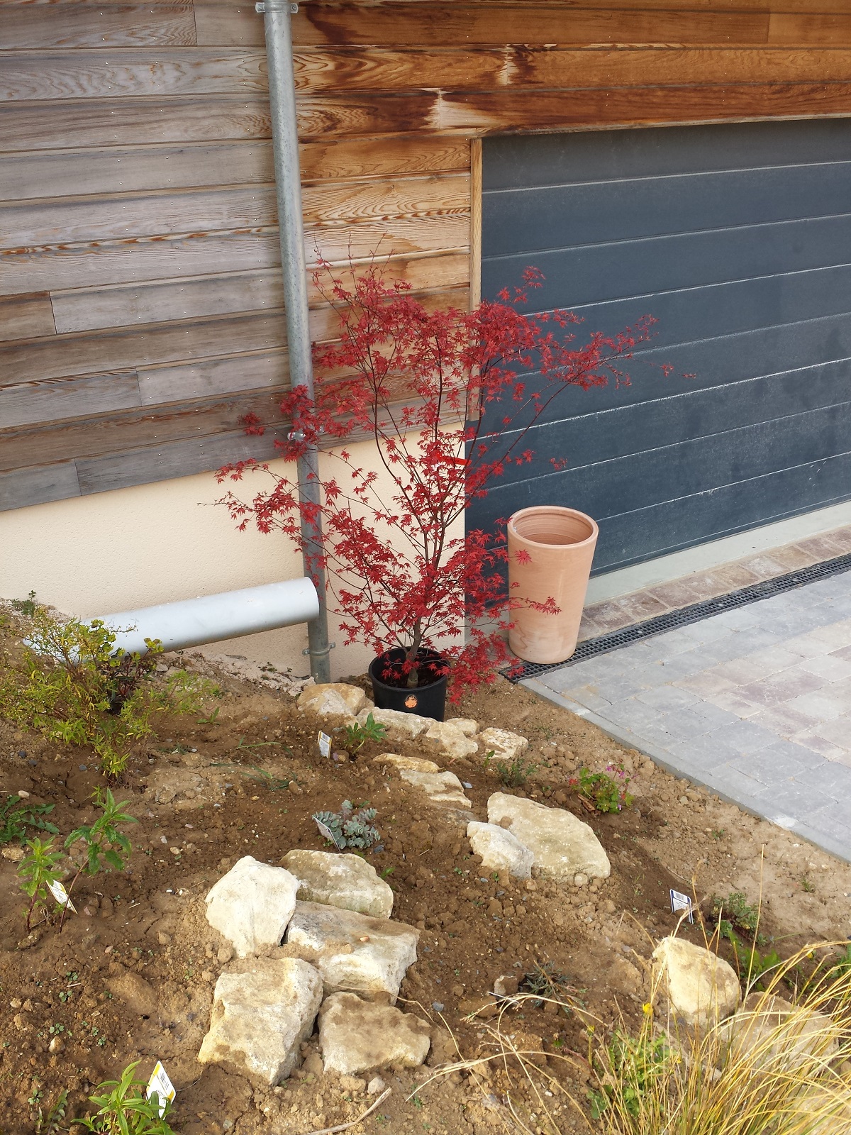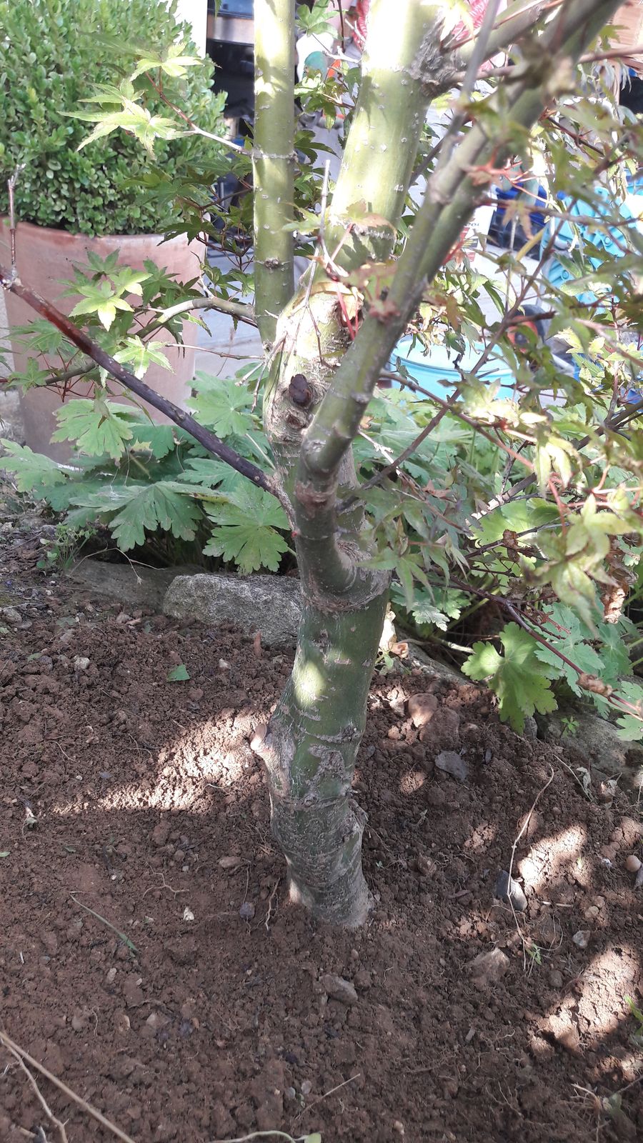 C'est un arbre que l'on nous a offert il y a 4 ans qui faisait déjà plus d'1m50 en pot. Il était magnifique. Nous avons choisi de le planter dans une rocaille qu'un payagiste nous a créé. C'est une terre argileuse et le terrain est donc en pente dans la rocaille. De la terre de bruyère a été rajoutée ainsi que de la corne broyée dans le fond du trou. Lors du transfert un accident a dû survenir et il a perdu plus de 70cm (branche principale qui partait en hauteur cassée). On ne l'avait pas bien vu. L'entreprise nous avait dit l'avoir raccourci pour favoriser sa reprise et que les pousses allait revenir vite. Aujourd'hui on voit bien la cicatrice d'écorce arrachée. Bien que diminué il a continué à faire de belles feuilles colorées tous les ans mais il ne croit guère. De plus le reste de la végétation de la rocaille est devenue un peu envahissante (notamment une spirée juste au dessus dont les branches sont venues à l'intérieur de l'acer).