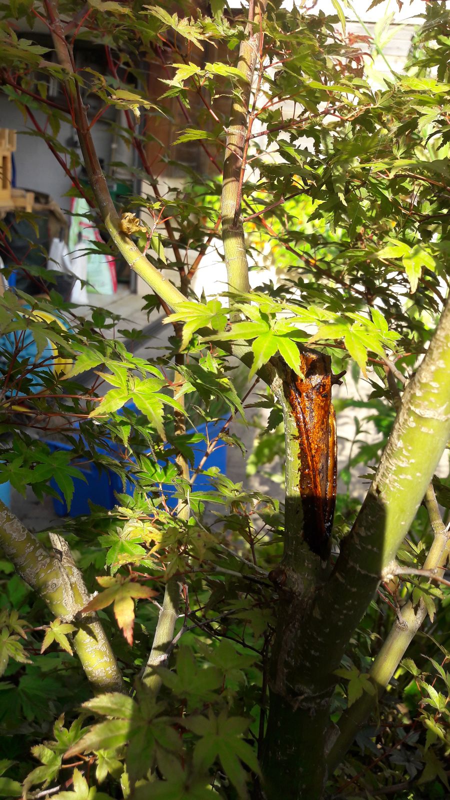 Le résultat est que tout le côté de l'acer en contact avec la spirée est désormais du bois mort que j'ai retiré le mois dernier. J'ai également raccourci très fortement la spirée pour le laisser respirer.