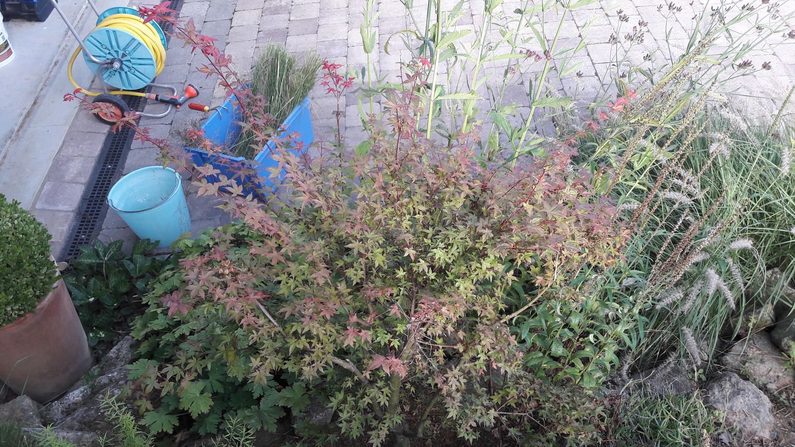 Dans l'idée, il devait être la pièce maitresse de la rocaille et dépasser le reste de la végétation mais là il est noyé dans la masse.