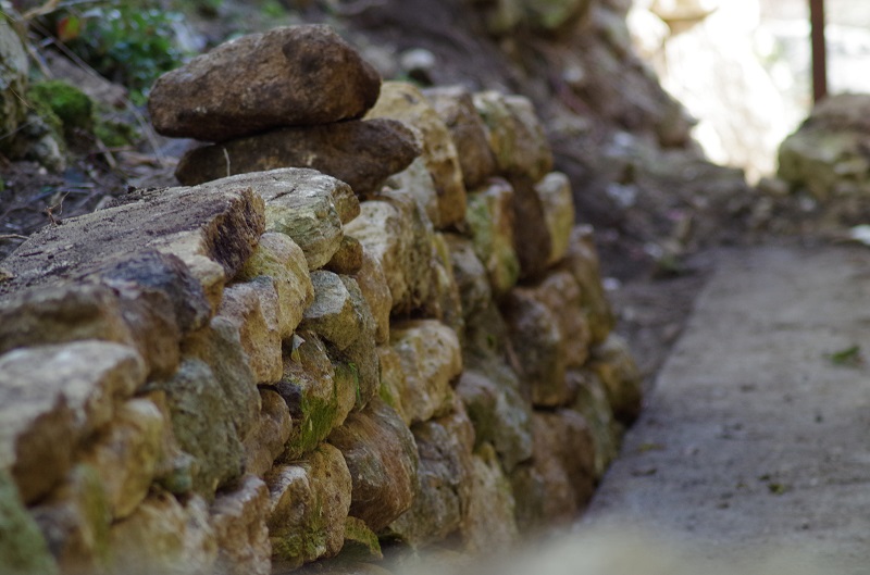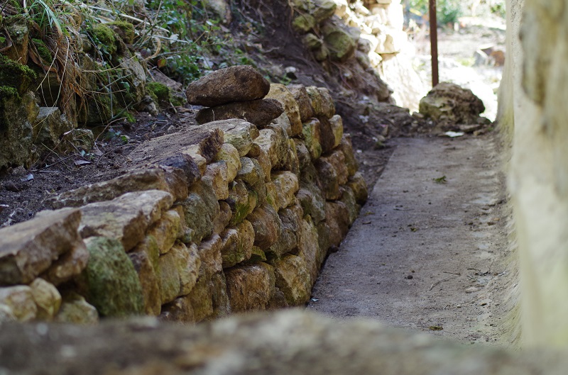 J'ai dégagé et étanché l'arrière de la maison en raison de l'humidité que cela amenait . Maintenant je suis en train de monter un muret en pierres sèches (pas un gramme de mortier ) . Je ne met que des grosses pierres en espérant que cela décourage les sangliers .