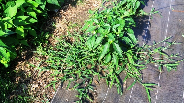 Une Digitaire sanguine a colonisé le pied d'un poivron. Elle profité des nutriments abondants apportés à la Solanacée. D'où sa taille inhabituelle.