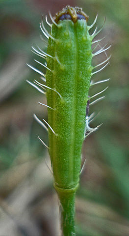 La capsule est allongée , avec des gros poils , et s'élargit vers le sommet.