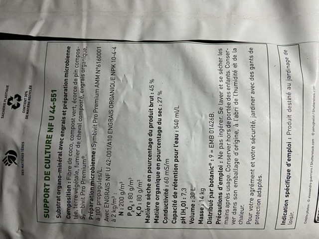 (On ne connait pas la proportion de tourbe, brune probablement et elle a la réputation de conserver trop d'eau).