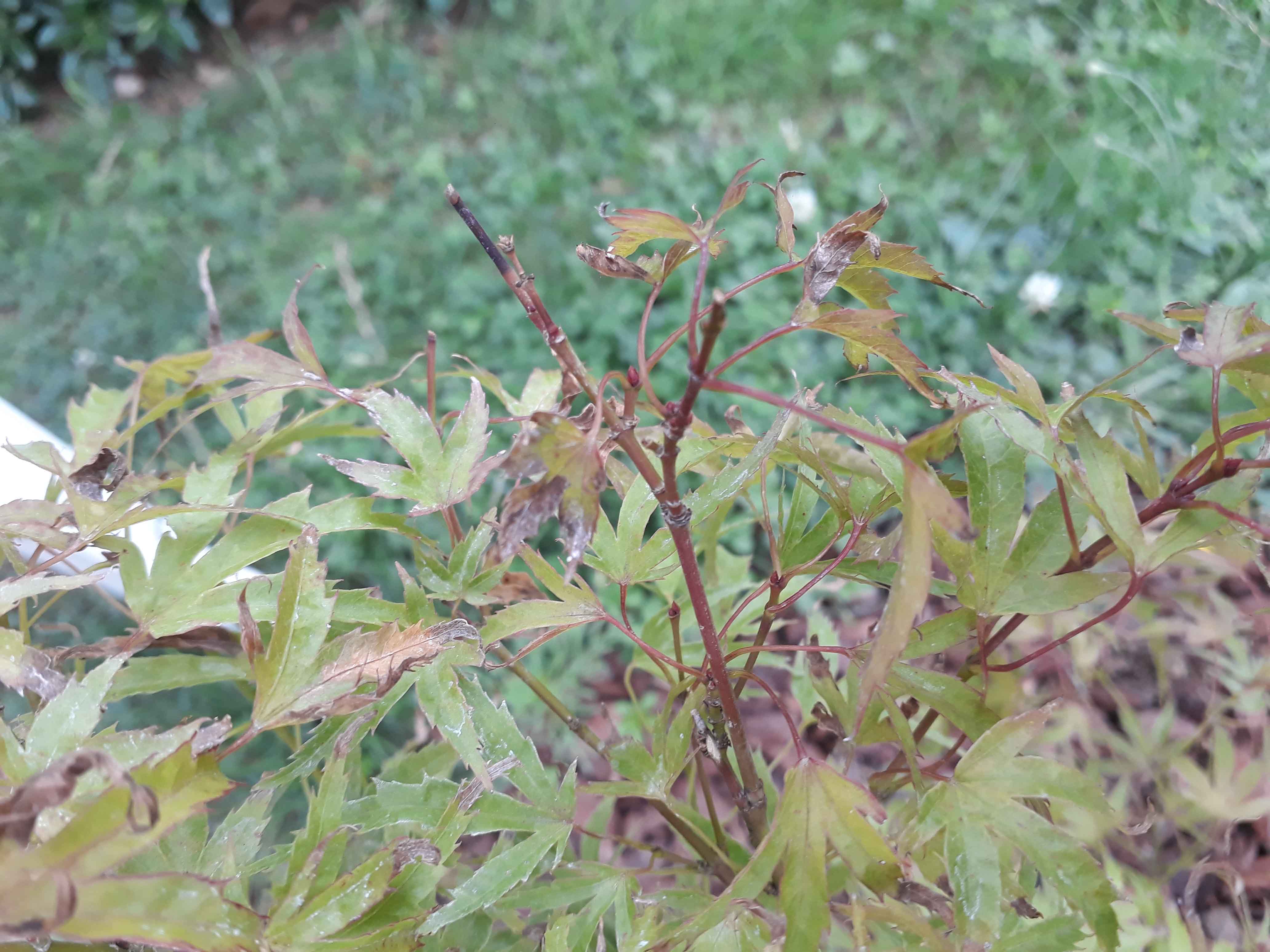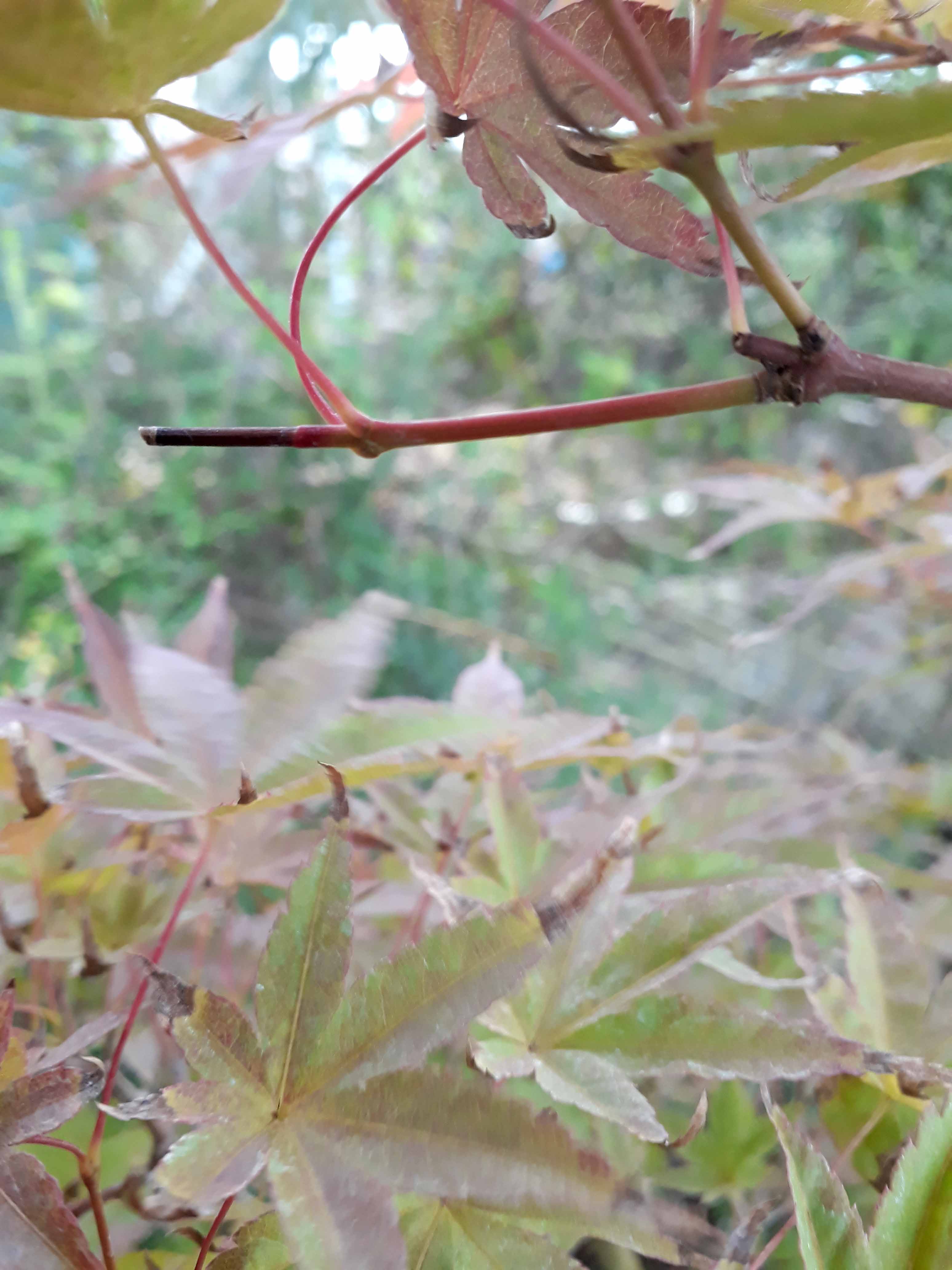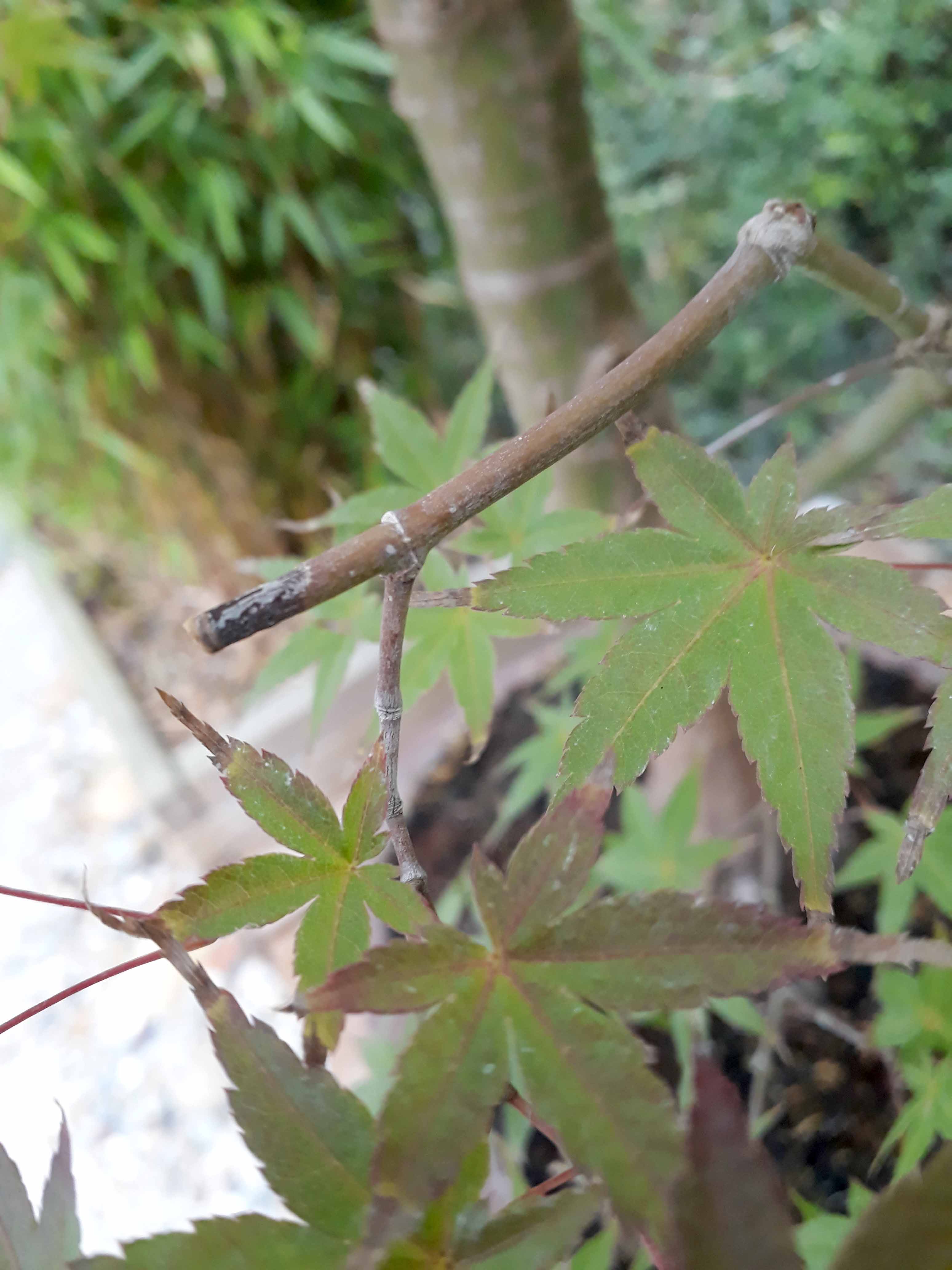 - abandon naturel d’une branche entière. Généralement celà se manifeste par un brunissement général mais certaines branches peuvent abandonner lentement, dans ce cas elles commencent par se colorer d’orange. Pour une branche ou brindille de palmatum à l’écorce habituellement verte, la coloration orange est l’indice que la sève est faible et que l’abandon est proche (à pondérer en fonction des variétés).