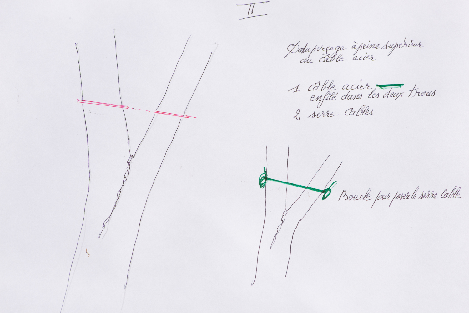 Dans les deux cas, (soit le câble ou la tige filetée*), ils seront rapidement emprisonnés par le bois qui va accroître ses tissus. La résistance sera considérable.