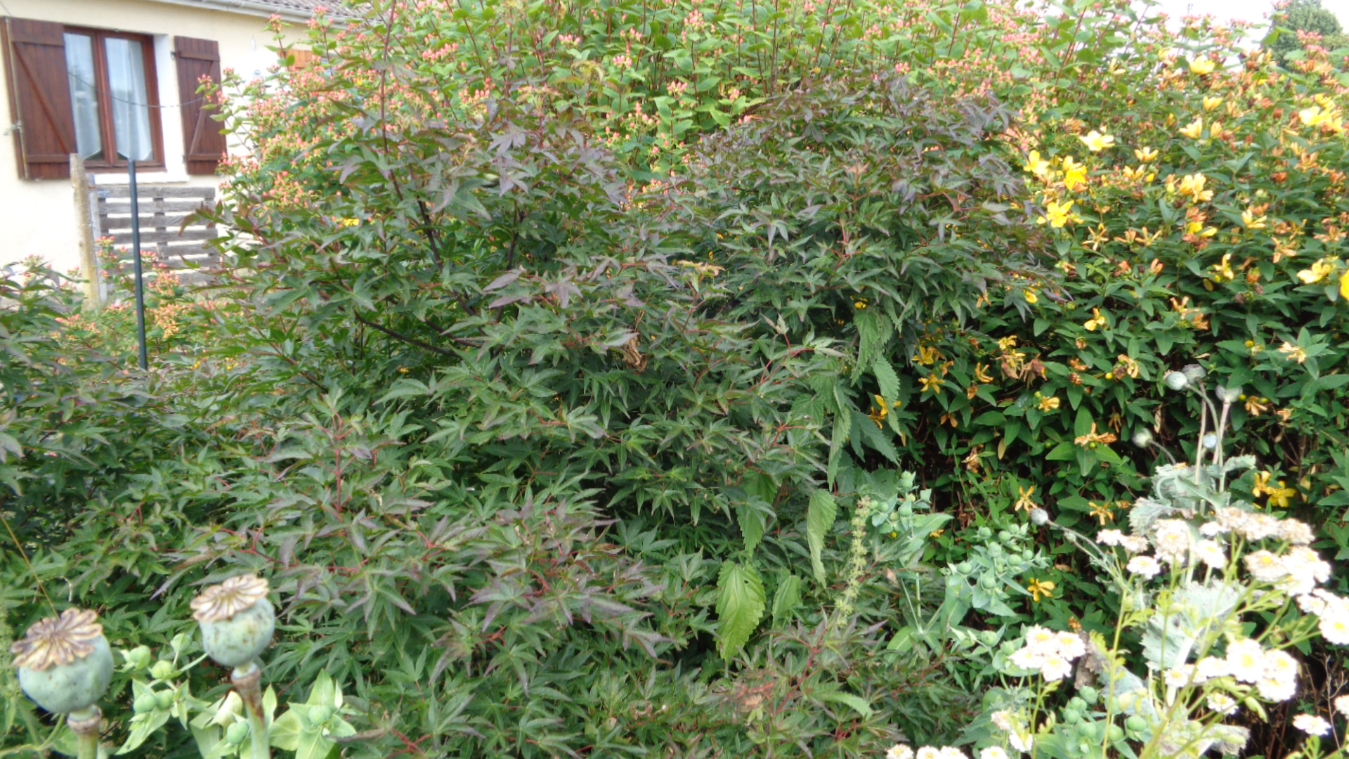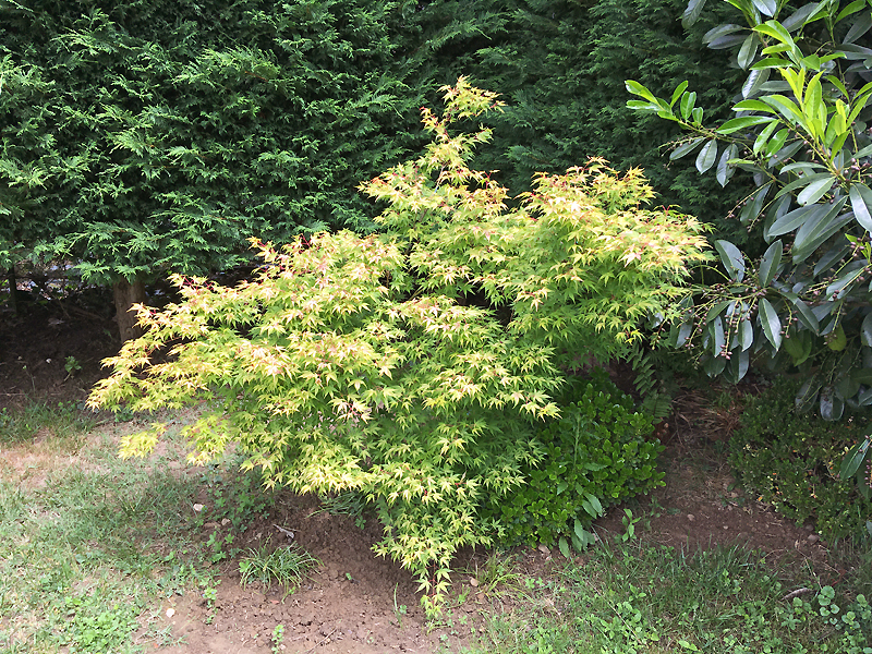 Bonsoir Helfrider et CHANIWA ; mon érable est en plein soleil toute la journée . Les androséamum et hidcote lui font un peu d'ombre sur son flan , c'est tout . Je suis moi même intrigué par les photos vus de prés mais comment dire , sur mon Katsura il y a beaucoup de feuilles différentes alors j'ai zoomé sur des atypiques . C'est pour cela je pense que vous êtes un peu surpris . Les autres feuilles sont vertes . Et je crois me rappeler que les jeunes pousses sont presque jaunes , donc normalement tout est bon . Comme on l'a déjà lu sur le forum ce sont toutes ces petites différences entre les même cultivars qui font tout leurs attraits