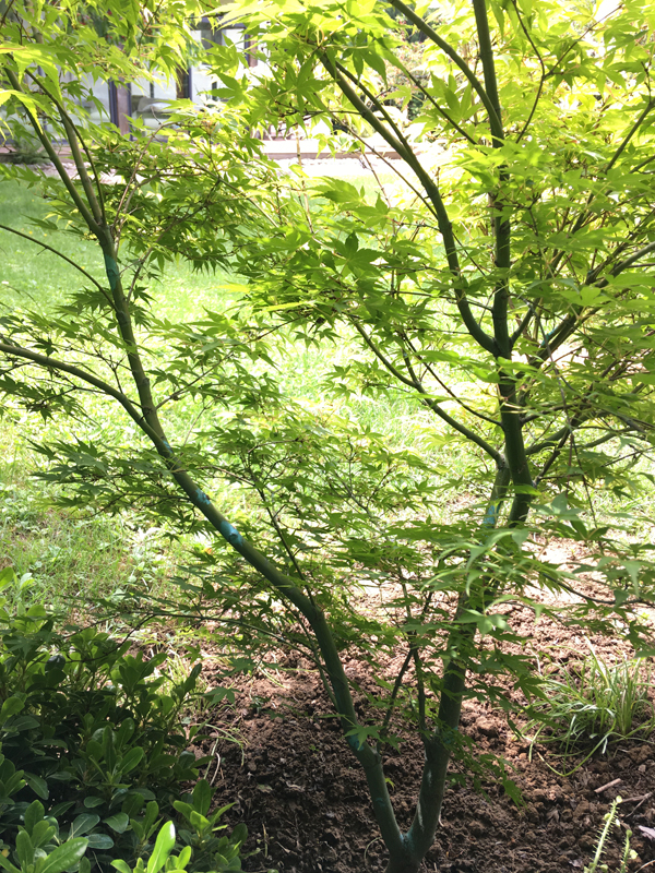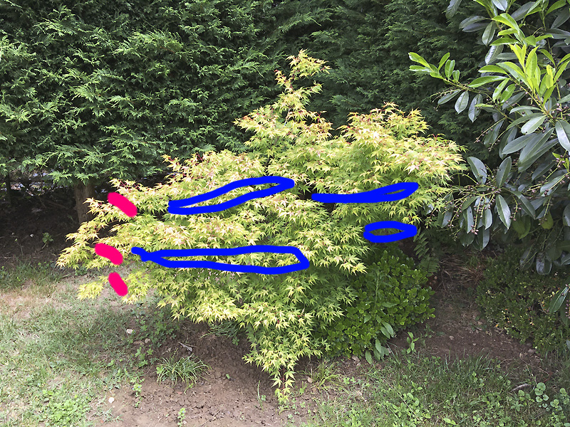 Depuis combien de temps ce ‘katsura’ est en pleine terre ? Je ne sais pas. Mais avant il était en pot. En pot, il avait des dominances apicales, (modérées puis qu’il est natuellement buissonnant) , depuis qu’il est en pleine terre ces dominances s’adaptent aux nouvelles conditions; au sujet des dominance apicales, cette adaptation est lente , je dirais même que ton érable à dû vivre dans une certaine contradiction son changement d’orientation (les orientations des branches principales en conservent la mémoire). Tu dois maintenant faire avec.
