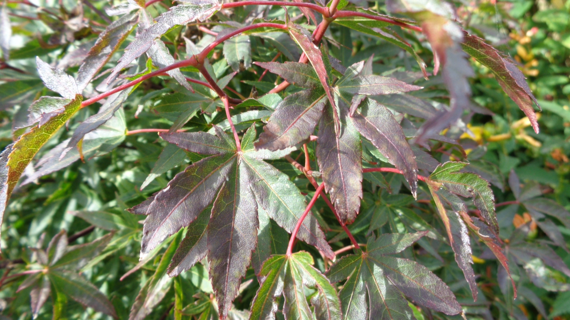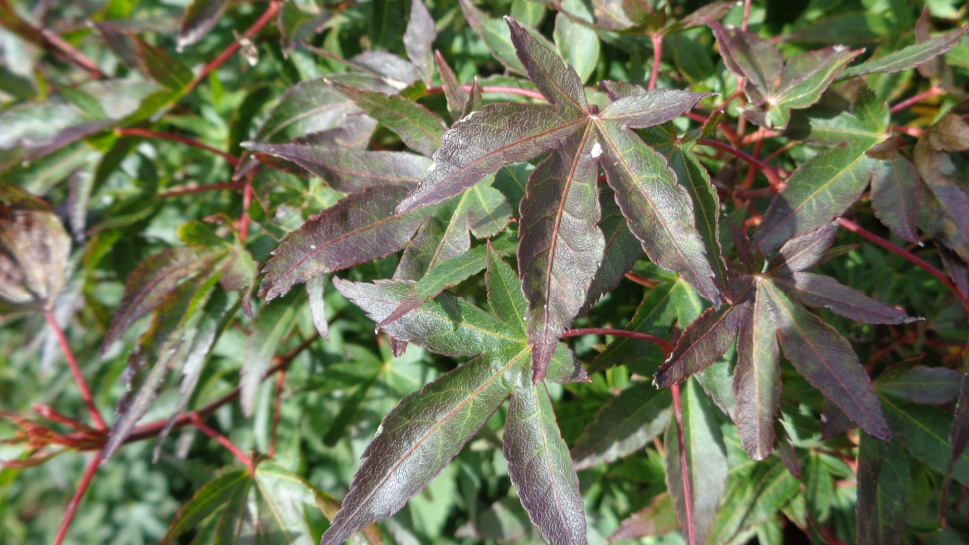 Katsura ou Red wine ? Toutes les photo ont étaient prises par un temps nuageux . Photo 1 et 2 : Jeune pousse à l'ombre de son propre feuillage . Photo 3 feuilles à l'ombre des tiges feuillues . Photo 4 (feuilles adultes) et 5 (jeune pousse) au soleil en temps normal mais temps nuageux au moment de toutes les photos .