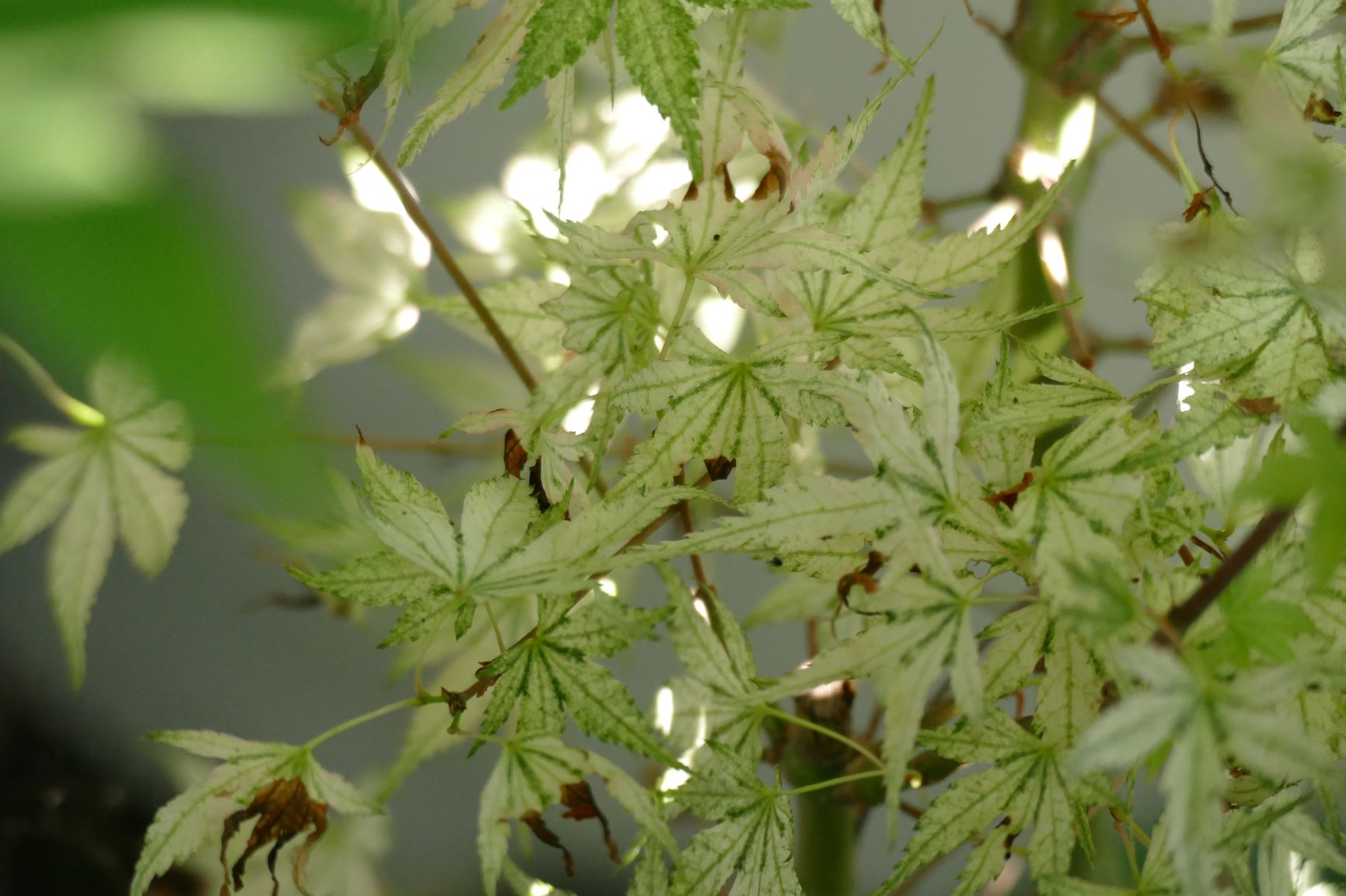 On verra l'année prochaine pour les couleurs définitives, mais pour l'instant rien de spectaculaire. Mais du potentiel pour l'année prochaine. J'ai l'impression que les couleurs sont plus belles sur ces variétés (comme butterfly ou ukigomo) en prenant de l'âge. La les nouvelles pousses sont vert claires. Je les ai mis à l'ombre. Par contre le port est relativement dense et légèrement pleureur. Tu confirme misologue ? Ça va pas être facile à conduire.