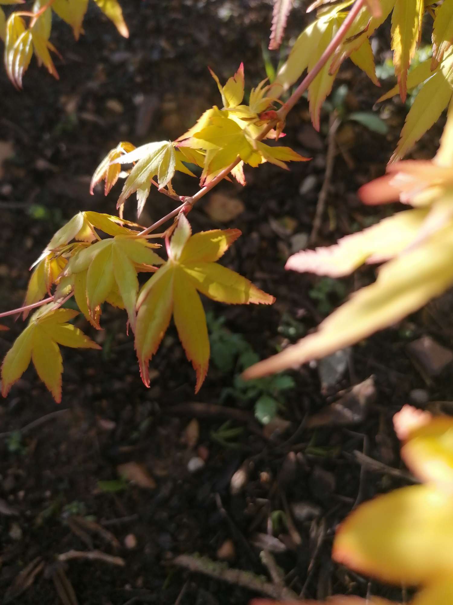 J'aimerais vous présenter aujourd'hui 'ueno yama' : "ueno" est le nom d'un parc de Tokyo qui a été construit sur une colline souvent appelée " ueno yama " ou " ueno mountain ". Ce parc a été un lieu de célébration de la culture japonaise, en particulier à travers les fleurs des cerisiers qui bordent le chemin qui mène au parc. On devine assez facilement pourquoi ce nom a été choisi pour ce cultivar qui sait se faire remarquer au printemps : la couleur de ses feuilles est d'un jaune doré très lumineux avec une tonalité orange-rougeâtre sur les bords, ce qui lui donne une apparence globale orange vif, presqu'autant que 'katsura'. En avançant dans la saison la couleur vire au jaune-vert vif et passe en été au vert franc. Il est donc semblable à 'Katsura', 'orange dream', palmatum 'aureum', mais aussi 'akane', 'callico' et bien d'autres. Je ferais une petite comparaison entre tous ces cultivars au printemps prochain. Il existerait 2 formes, une européenne (plus jaune doré) et une japonaise (plus orange doré)... A l'automne enfin ses feuilles prennent des teintes orange -rouge. Surtout, selon divers témoignages, il est connu pour débourrer plus tard que 'katsura', une bonne quinzaine de jours après lui (il évite ainsi les gelées tardives). A vérifier... Egalement, il résiste mieux au soleil et à la chaleur que 'katsura' et 'orange dream', ce qui est encore un autre avantage. Ses feuilles à 5 lobes sont plus grandes que celles de 'katsura'. Il a un port en boule et il est nécessaire de le tailler pour lui donner une forme plus aérée, comme sur la photo.