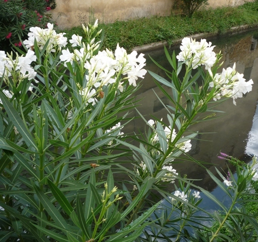 Ben, c'est un laurier-rose (nerium oleander), mais blanc à fleurs simples. Dans ta région, en pot, en pleine terre, peu d'arrosages, mais copieux tant qu'il est jeune. Plante sans souci.