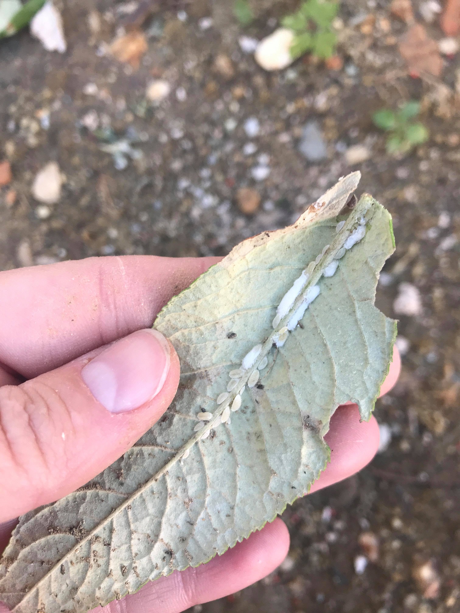 Sauf qu’en regardant de plus près, il y a une quantité astronomique de petites bêtes blanches laiteuses sous presque chacune des feuilles de mon arbre !!!