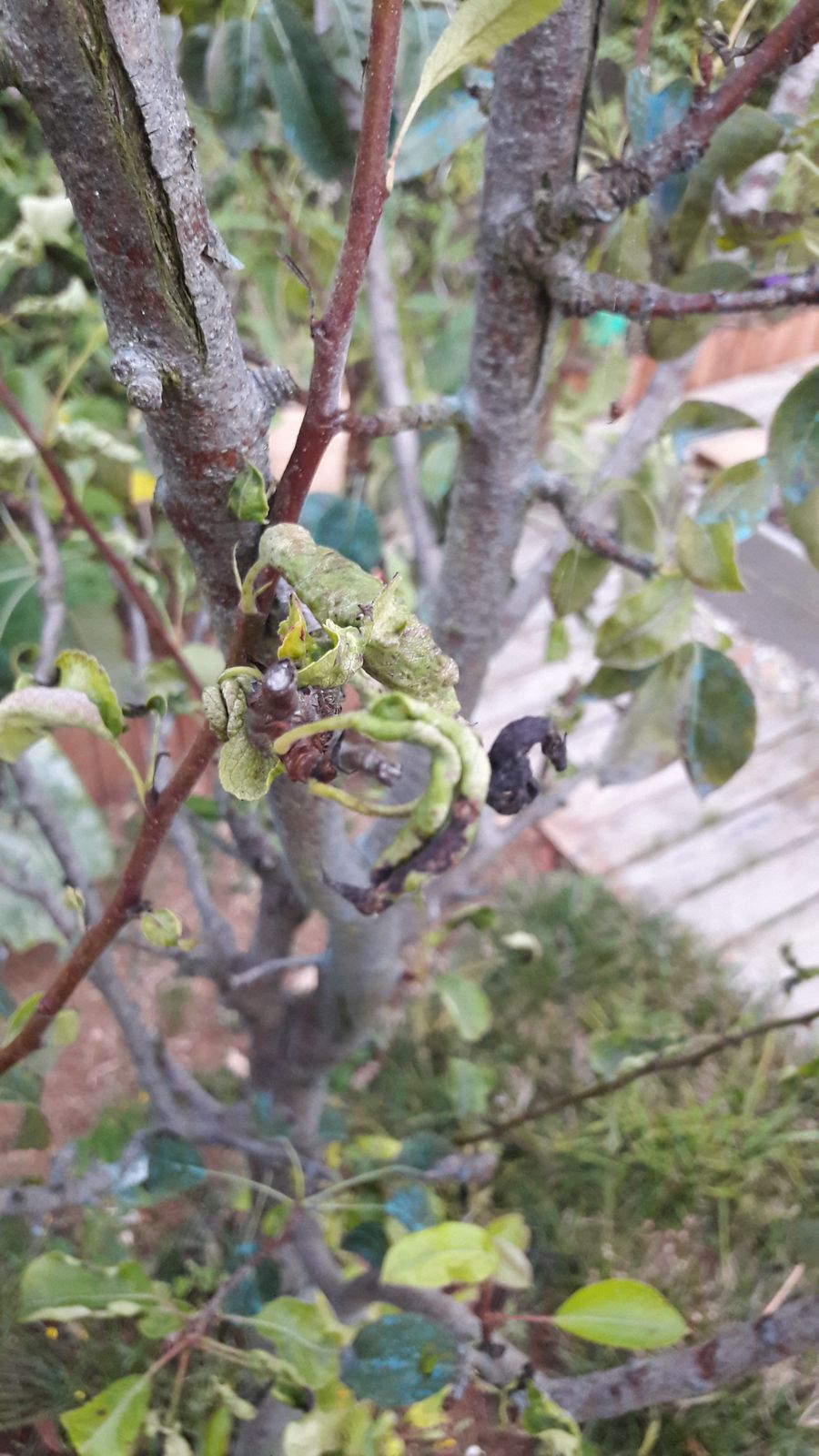 A noter que j'ai un autre poirier Guyot qui donne des poires celui-là mais qui montrent également des symptômes tous les ans. En revanche sur celui-là, je n'ai pas eu autant d'abandon de branches et il est vigoureux. Il ne semble pas greffé non plus. J'ai eu les 2 en cadeau et planté en même temps.