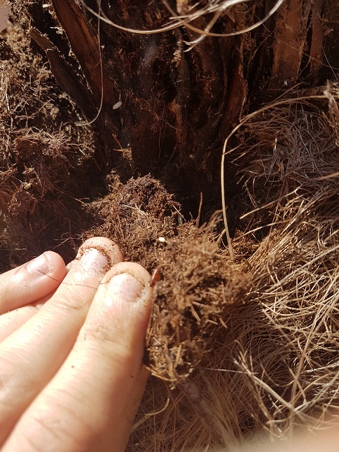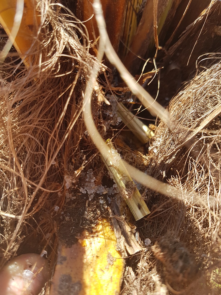 La base des palmes vertes a servi de réceptacle et j'espère que les nématodes ont pu continuer à s'infiltrer par entonnoir dans le tronc.