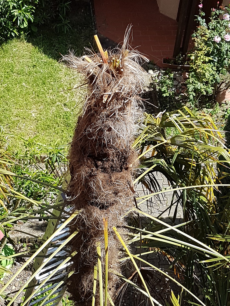 Cette question renvoie finalement au fait de savoir si les jeunes palmes coupées peuvent repartir de cette base ou il fait arracher à la base (C'est quand même très résistant et je suis en hauteur donc même en tirant dessus, elles tiennent) pour favoriser la formation de nouvelles jeunes palmes?