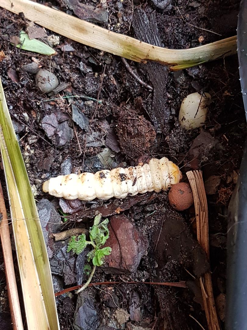 En arrachant certaines parties de terreau et pourriture entre les palmes vertes de mi-hauteur et le cœur final j'ai découvert une douzaine de larve que j'ai enlevé une par une.