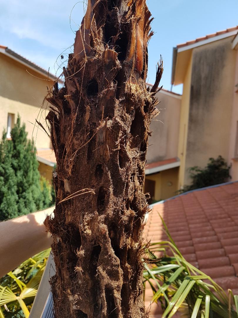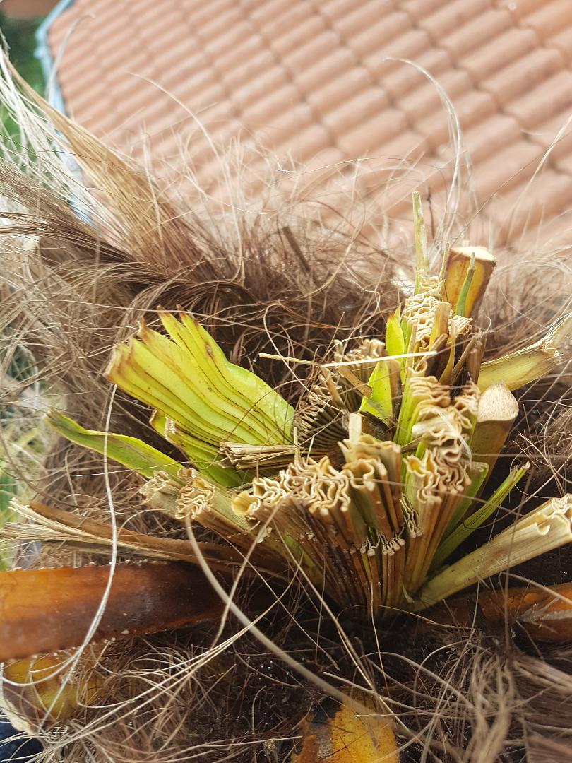 La seule tige qui tient vraiment est celle que tu vois et que j'avais déjà réduite car la palme était pourrie. Pas de nouvelles pousses donc est-ce que d'après toi il peut encore se relever sachant que les galeries ont déjà presque détruit toute la partie supérieure.