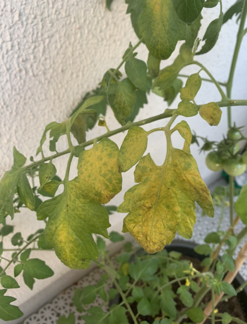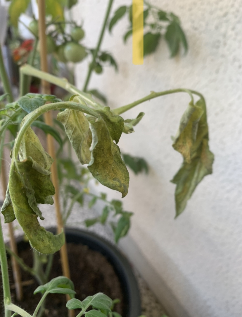 Et j’ai aussi des plants de tomates cerises qui ont aussi un problème similaire : certaines tiges et leurs feuilles jaunissent, se flétrissent puis sèchent. J’ai l’impression qu’il y a comme des micro toiles d’araignées très discrètes sur l’arrière des feuilles mais ça se remarque à peine et je ne constate la présence d’aucun insecte. J’ai enlevé les tiges concernées au fur et à mesure mais cela ne semble pas stopper la progression du problème, qui a débuté par les tiges du bas et remonte progressivement.