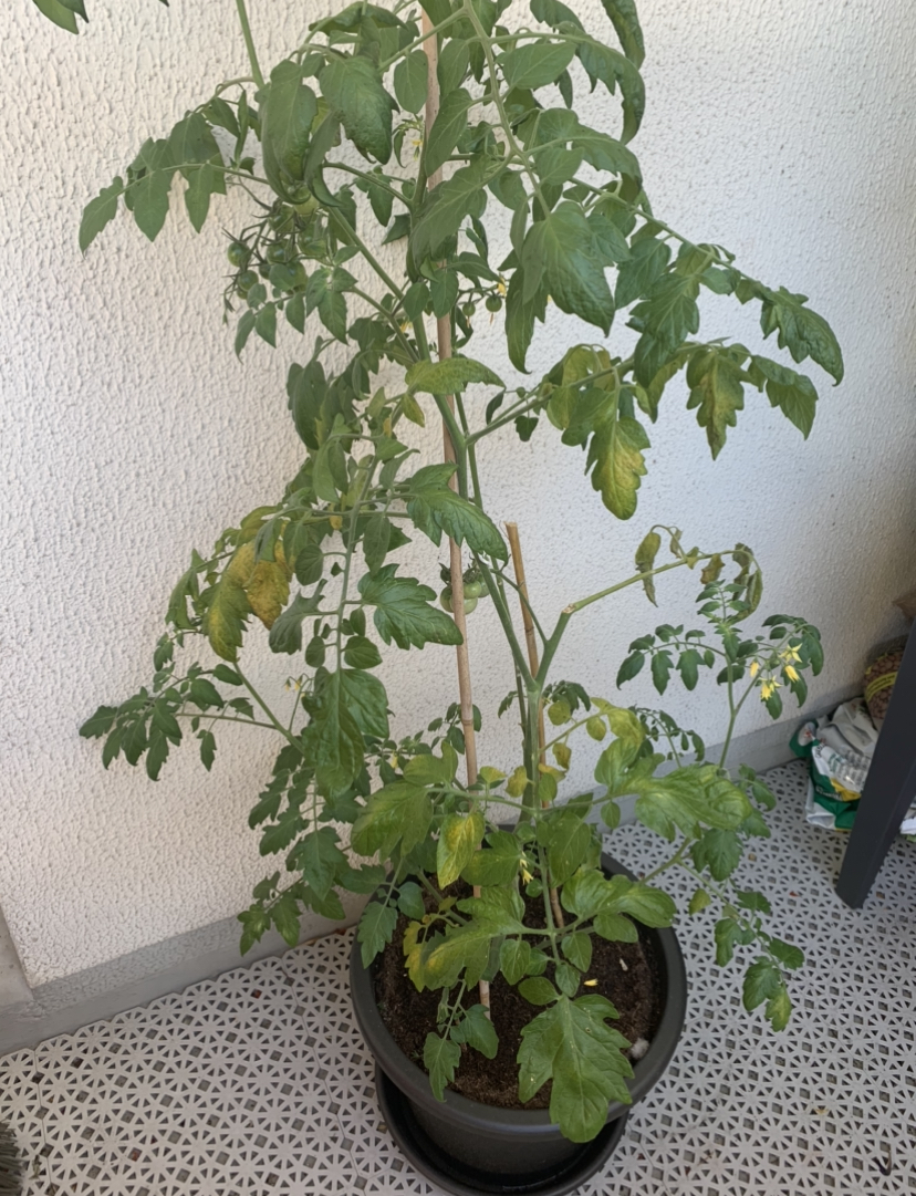 Certainement une chlorose, déficit de la fonction chlorophyllienne. Trop d'arrosage ou épuisement des éléments nutritifs du sol. La taille du pot est incompatible avec le développement harmonieux d'un plant de tomate. Il faut au minimum un contenant de 30l.