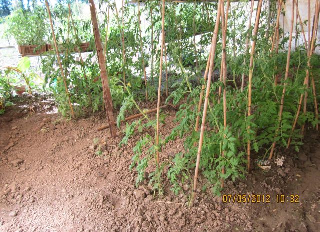 Photo (en hauteur) Melons plantés cet aprem' aux côtés des petites tomates qui restent en serre encore un peu. (les grandes sont arrachées et replantées dehors)