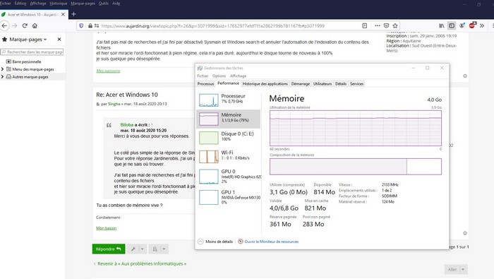 Regarde j'ai fait une capture d'écran, j'ai 4 GB de mémoire, le disque tourne toujours à 100%