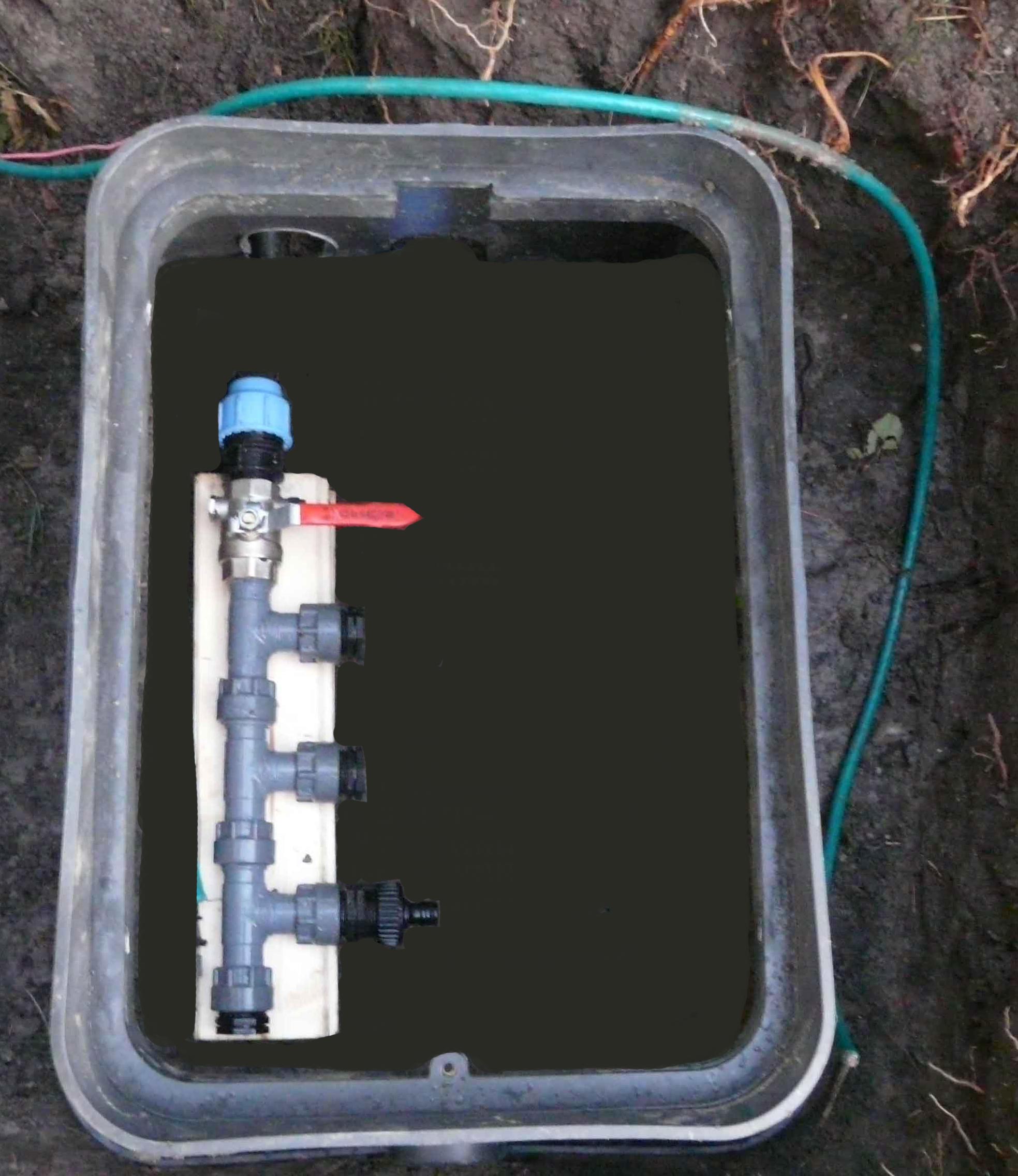 Le collecteur (gris) ne doit surtout pas être centré à l'axe du regard, mais proche de la paroi à environ trois centimètres. Les découpes existantes ne servent à rien, sauf si vous posiez une unique électrovanne en ligne. Placez votre collecteur comme cela dans le regard, vous serez moins embêté ultérieurement pour dépanner :
