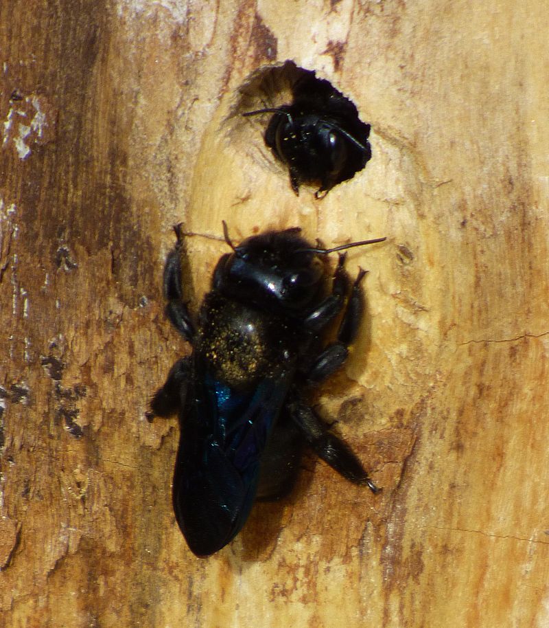 Photos toutes fraiches de Xylocope violacé. Cela faisait 2 ou 3 jours que je voyais ce petit hélicoptère tournoyer autour de mon citronnier. Mais ce n'est qu'en faisant la photo de la bête posée sur un billot de saule tétard que j'ai découvert son nid et de sa compagnes au bord du trou.