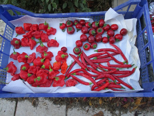 Des gorria (Espelette) qui sèchent divers Réunion, antillais, Sardaigne, achard Rocotillo, hotcherry etc