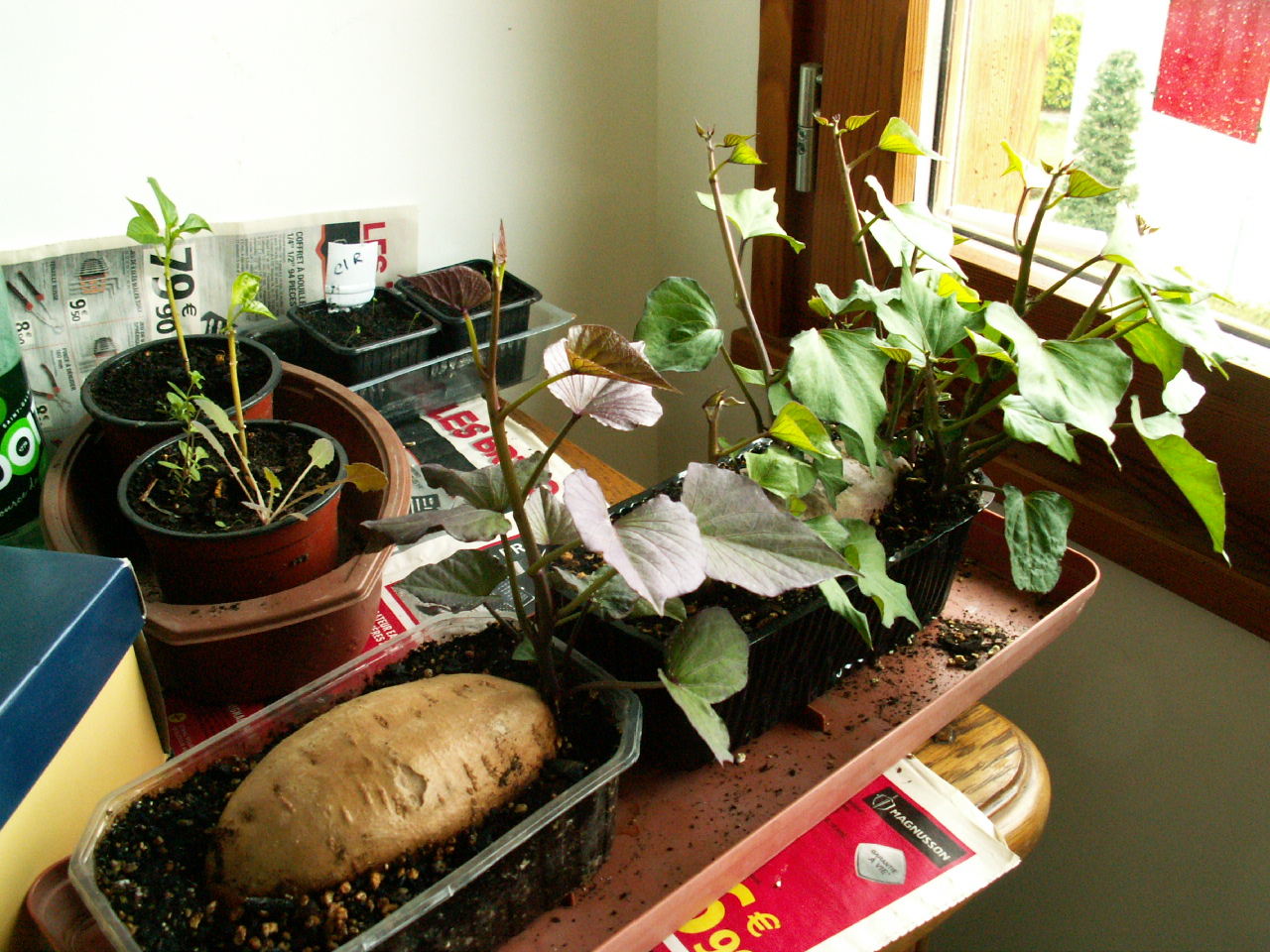 A la maison bien au chaud mes patates douces évoluent doucement (voir photo), je teste 2 variétés dont je ne connais pas le nom (achetées en magasin d’alimentation), il était simplement spécifié chair blanche pour l’une, chair rouge pour l’autre.